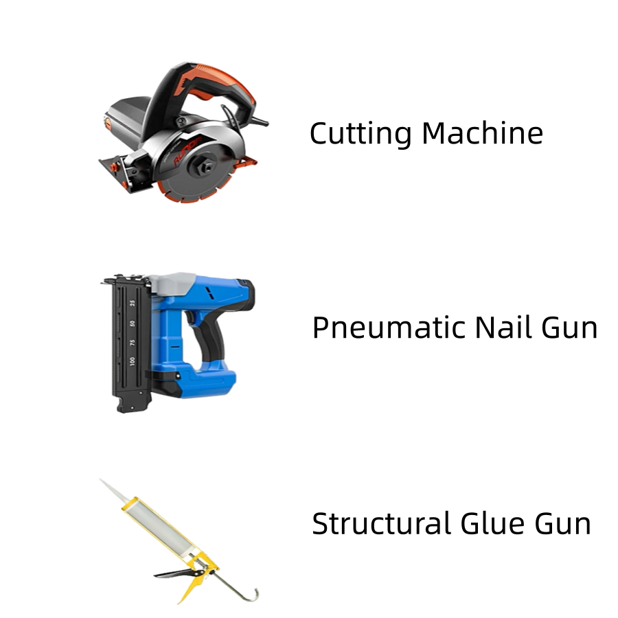 必要なツール: 切断機, 空気圧ネイルガン, 構造用グルーガン.