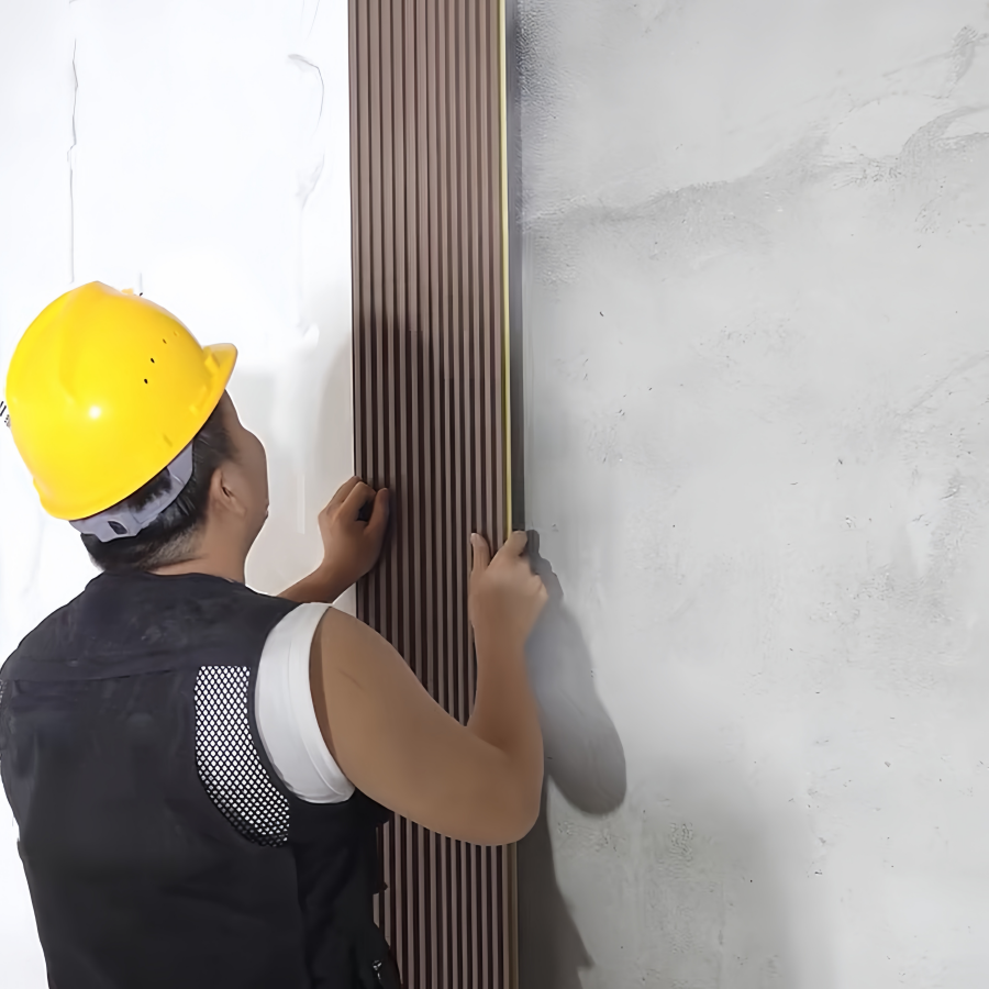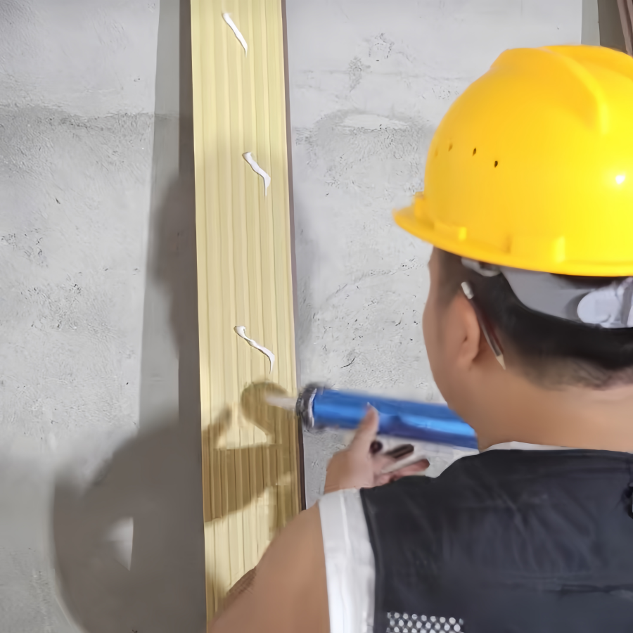 WPC 壁パネルの背面に構造用接着剤を塗布し、壁に取り付けます。.